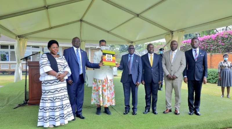 Winner of the 2019 World Population Day National Celebrations Bicycle competition receiving his prize from the 1st Deputy Prime Minister, Gen Moses Ali.
